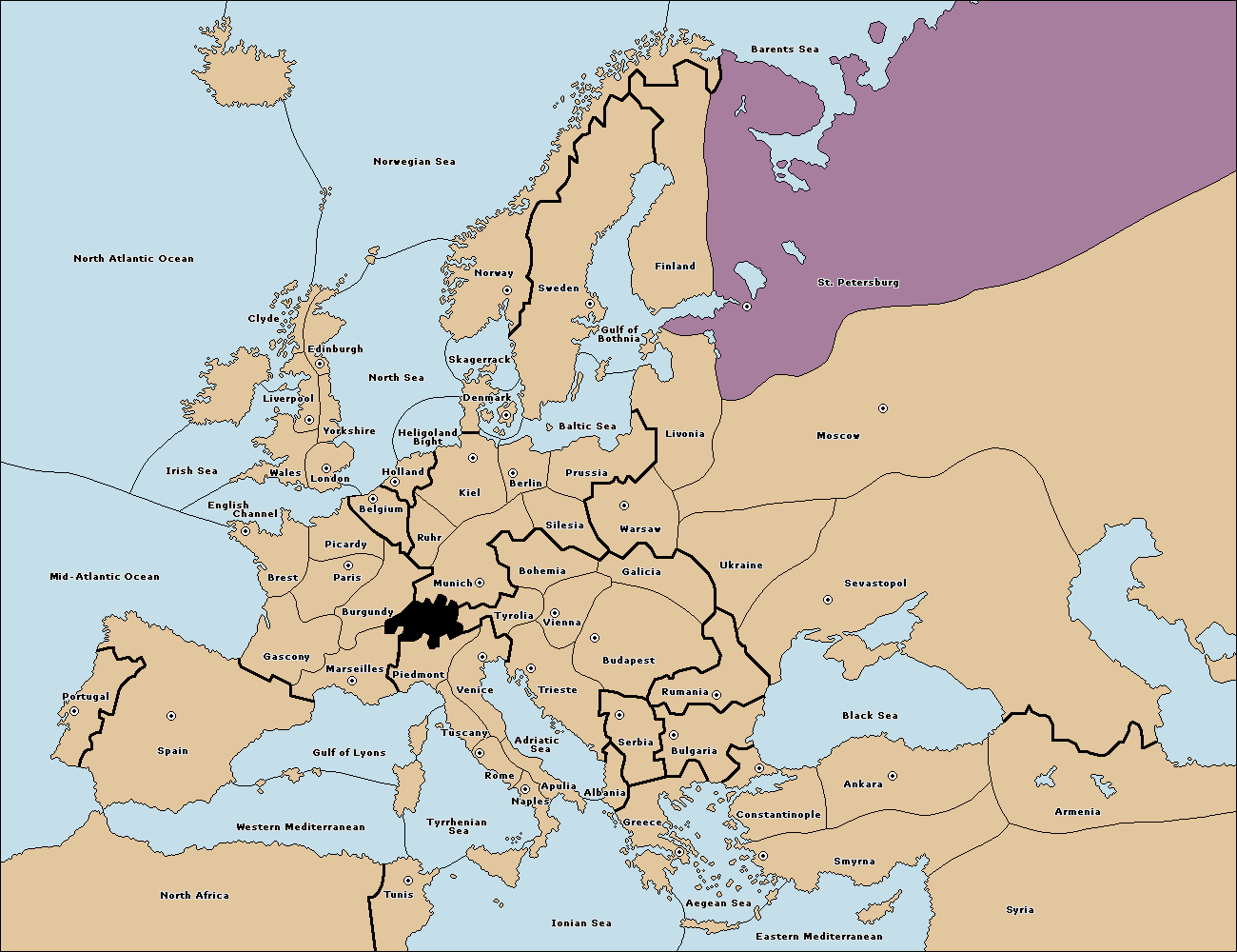 The standard Diplomacy map of Europe, but you can choose what countries you want to be playable.